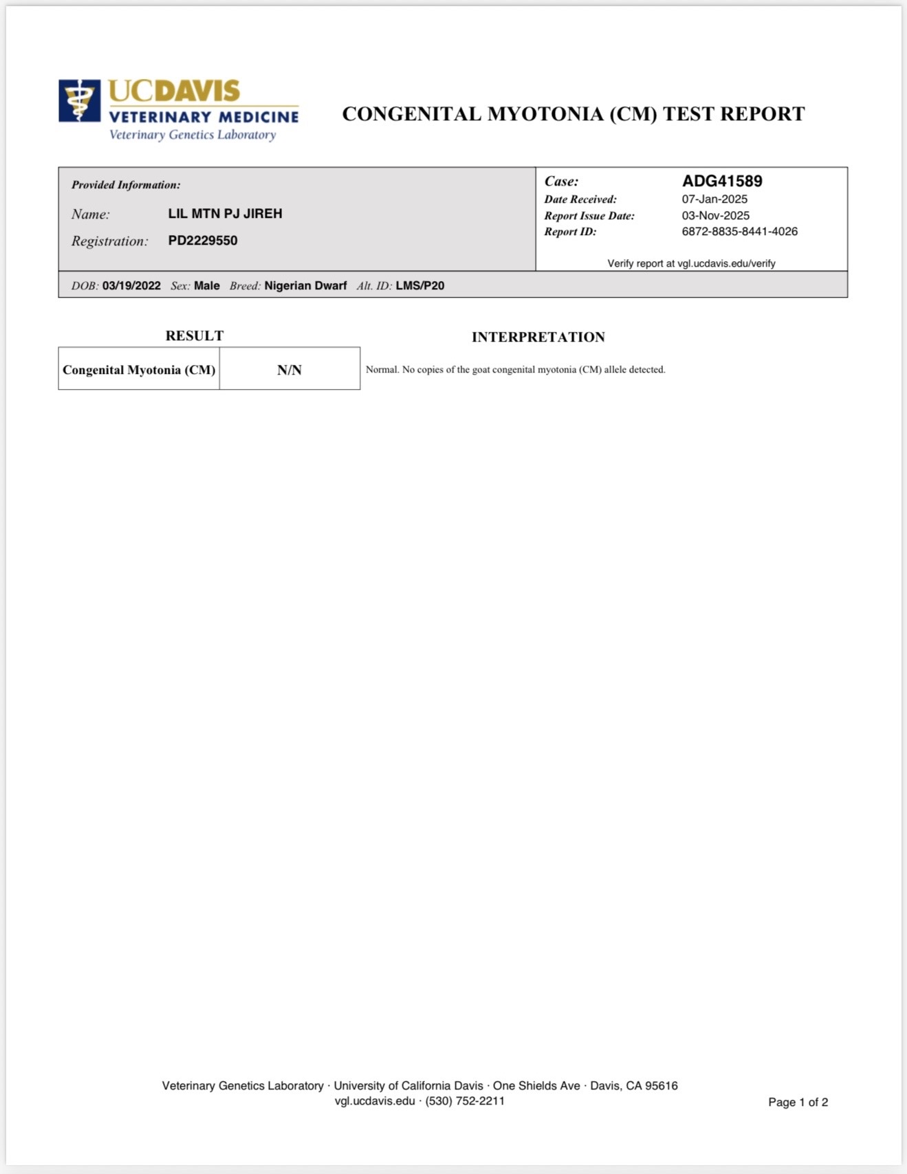 LIL MTN PJ JIREH 2Y BARN NAME: MILKDOB: 3/19/22SIRE: BETTER WAYZ EJ PEPPER JAYDAM: LIL MTN OA HOSANNASHOW WINS: ADGA GENETICS LINK LIL MTN PJ JIREH CONGENITAL MYOTONIA (CM) TEST REPORT 2Y FRONT 2Y REAR Sire Dam: dry yearling SD: 5*M VEEE90 SD: 5*M VEEE90 rear Progeny