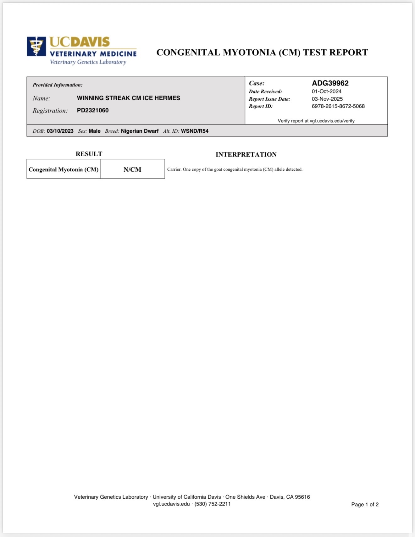 WINNING STREAK CM ICE HERMES 2Y 5.2025 BARN NAME: MAZEDOB: 3/10/23SIRE: GCH WOOD BRIDGE FARM COUNT ON ME +*B VVE88DAM: SDG POPTART’S PENELOPE – EEEE91SHOW WINS:rCH – Recycle Show 2024 – Emily MorganGCH – Son of a Buck Show 2024 – Don BergfieldrCH – Son of a Buck Show 2024 – Emily MorganrCH – Goats in Gatorland 2025 – Dan LaneyrCH – Browsin the Hub City 2025 – Grace Toy ADGA GENETICS LINK WINNING STREAK CM ICE HERMES CONGENITAL MYOTONIA (CM) TEST REPORT 2Y 5.2025 BROWSIN THE HUB CITY rCH – Grace Toy 2Y 2025 GIG rCH 2Y – Dan Laney 1Y 2024 SON OF A BUCK GCH 1Y – Don Bergfield S: Wood Bridge Farm Count on Me; 1st in rear udder height & arch traits on 2024 ADGA genetics S: Wood Bridge Farm Count on Me (rear) D: SDG Poptart’s Penelope EEEE91 Progeny